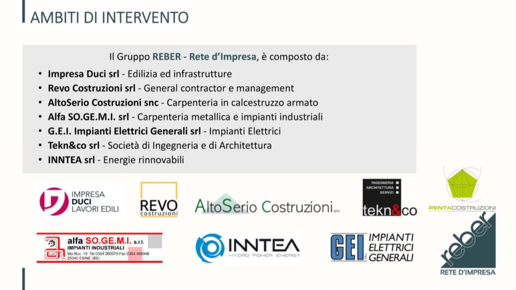 REBER è una rete d’impresa nata tra aziende del settore delle costruzioni e società d’ingegneria, con: – notevole esperienza in Italia ed all’Estero; – comprovata sinergia grazie ai molteplici lavori svolti dal gruppo; – affidabilità dimostrabile con innumerevoli referenze di enti pubblici e privati; REBER è una rete soggetto, cioè ha personalità giuridica e può firmare contratti in forma diretta; Scegliere REBER significa: AFFIDABILITA’ COMPETENZA: un organico globale di 150 addetti tecnici FLESSIBILITA’: modulazione delle azioni e delle risorse QUALITA’: un prodotto qualitativamente superiore PUNTUALITA’ e SERIETA’