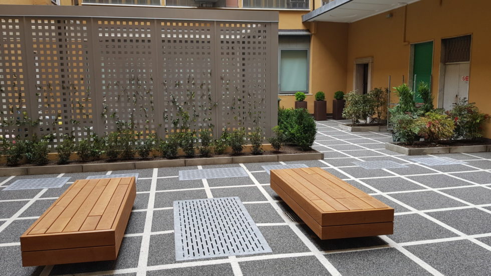 Rifacimento pavimentazione cortile interno, allestimento arredo urbano, creazione fioriere e piantumazione.